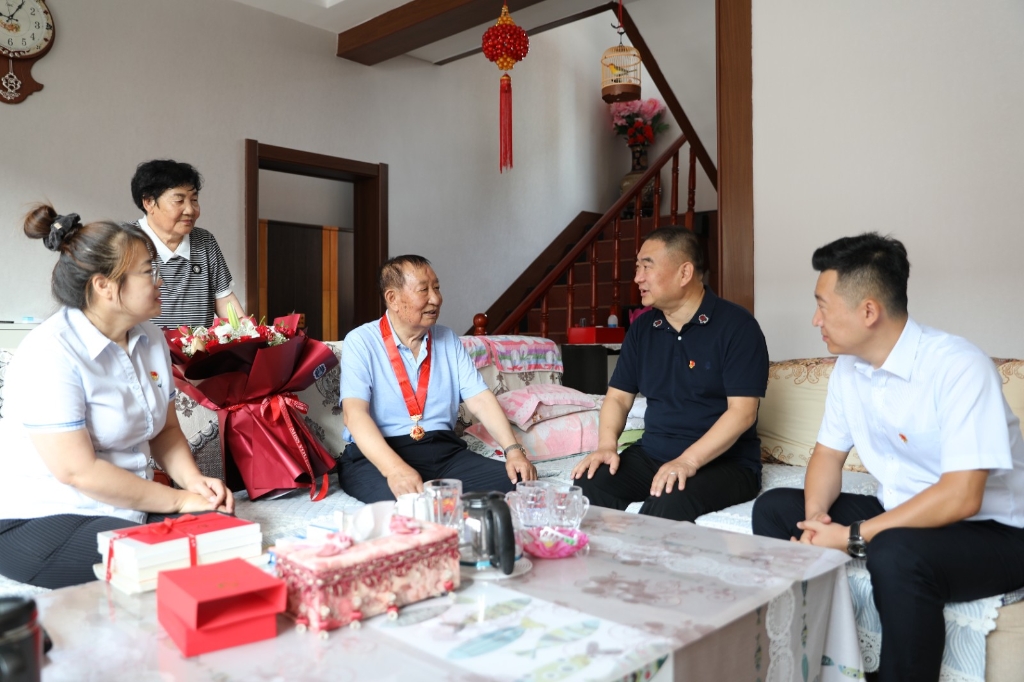 张立峰先后来到老党员葛玉林、刘志明 、温守峰 、贾花眼的家中,亲手为他们佩戴“光荣在党50年”纪念章,并与老党员亲切交谈,悉心询问近期身体和生活情况,转达党组织的关心关爱,聆听他们矢志不渝跟党走的感人故事。